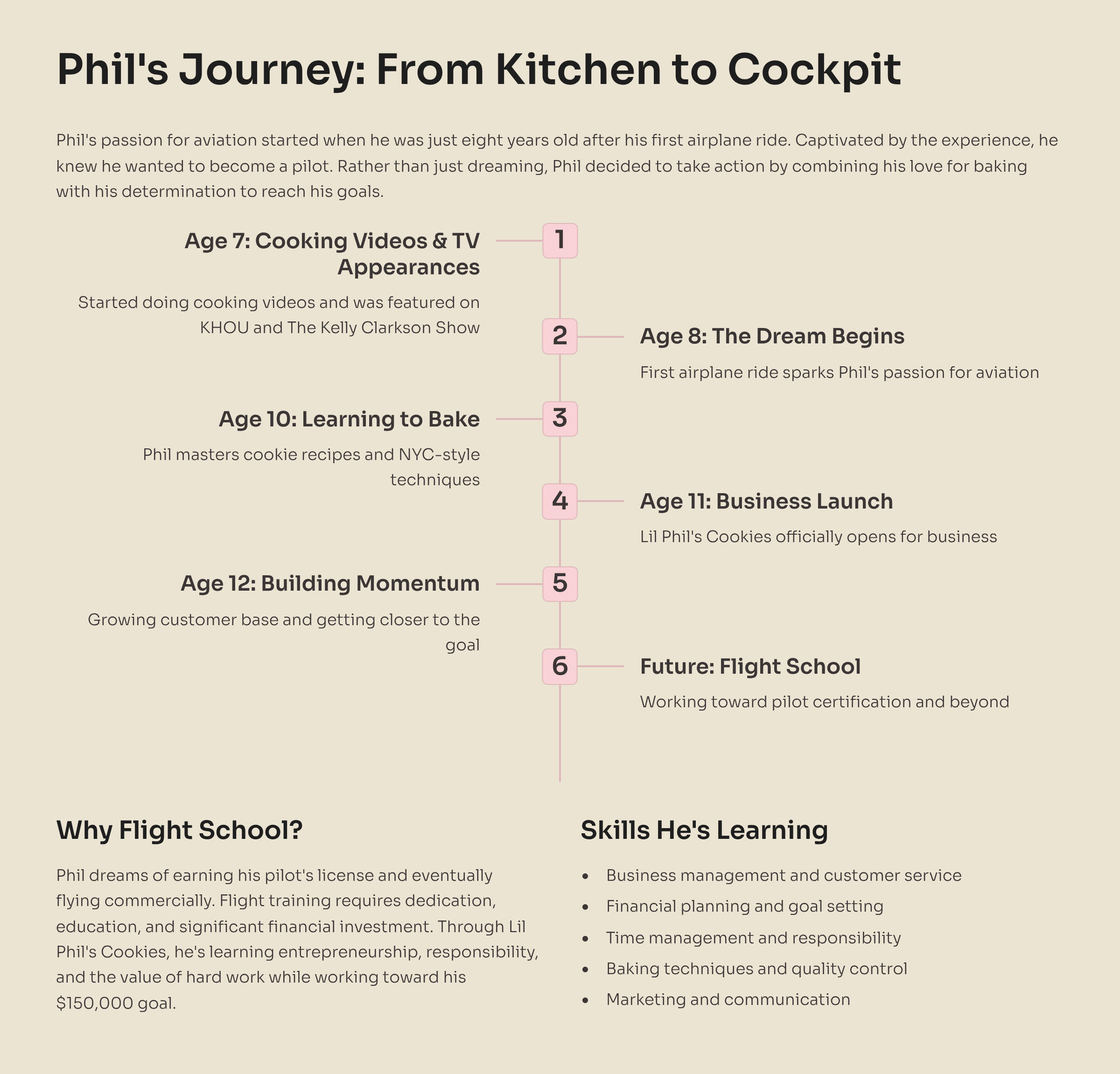 Phil's dream is to attend flight school and become a licensed pilot. Flight training is expensive, but with your support and every cookie purchased, we're getting closer to making this dream a reality. Together, we're raising dough—literally and figuratively!